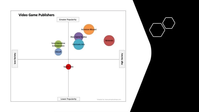 I plotted Nintendo alongside its competitors. As Nintendo is a consumer electronics company responsible for developing video game consoles as well as titles, I framed Nintendo as a video game publishing company, which would allow for a broader range of competitors to add to my data set. Nintendo (the right-most light red circle) is positioned alongside companies such as Xbox Game Studios, Activision Blizzard and Square Enix.
