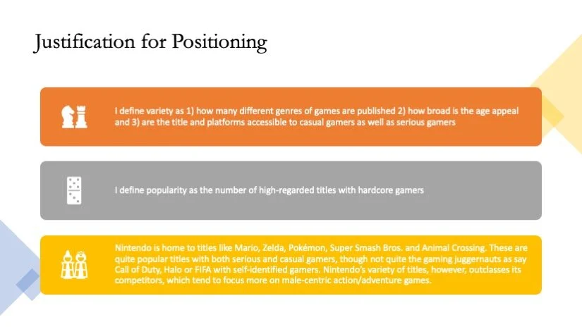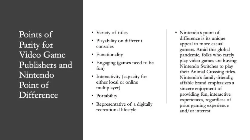 On the left is my list of points of parity for video game publishers, along with some clarification on terms that I use. Beside this, I wrote a paragraph arguing what I believed were the unique aspects of Nintendo’s brand that set it apart, based on deeper research and an analysis of current events.