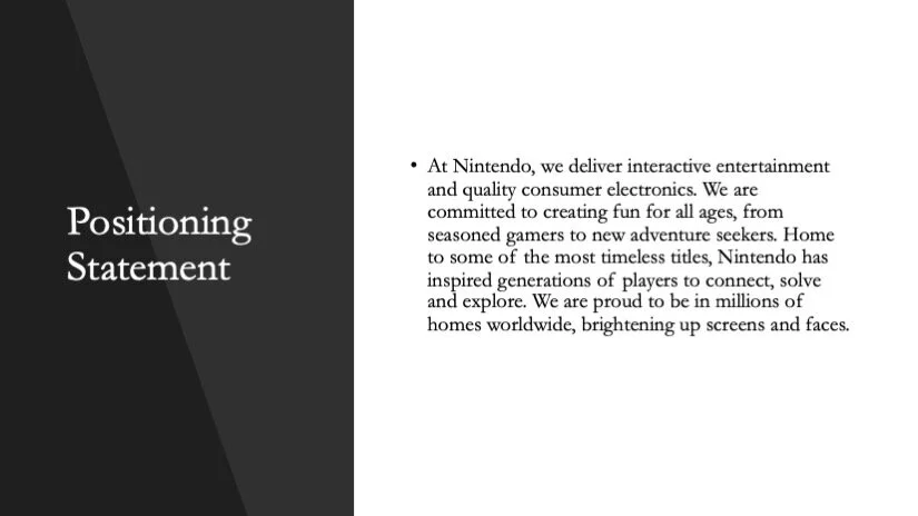 Through the positioning statement, contained to a 4-5 sentence range, I conjured an interpretation of the brand’s voice given my projections of Nintendo’s target, frame of reference, point of difference, and reasons to believe.