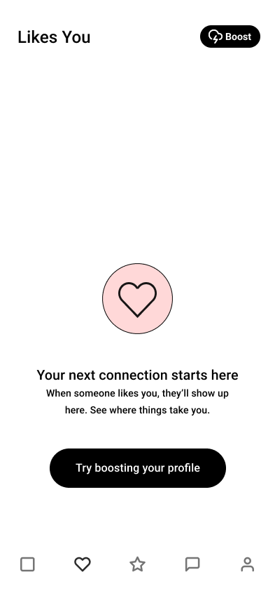 “Your next connection starts here. When someone likes you, they’ll show up here. See where it takes you.” lays out both function and next steps in plain language.